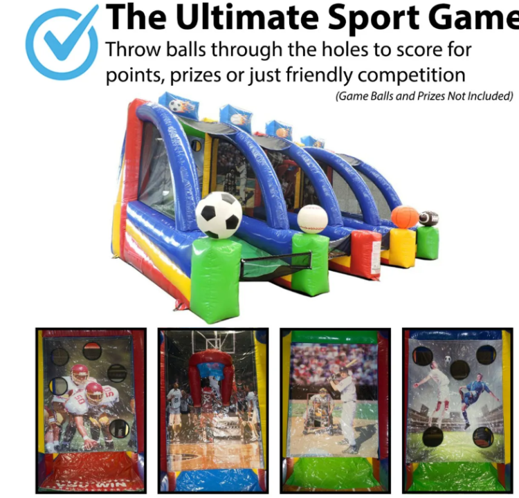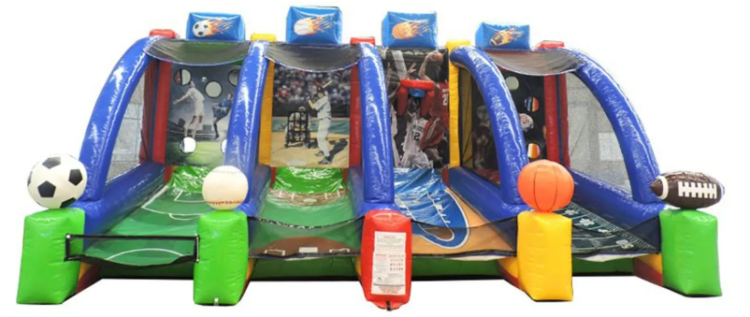 Bring the thrill of the stadium to your next event with this 4-in-1 Inflatable Interactive Sports Game — a colorful, action-packed rental that turns friendly competition into big-time fun. Four side‑by‑side lanes each feature a themed target challenge (soccer, baseball, basketball, and football visuals) so multiple players can compete at once. Guests toss game balls through the holes to score points, win prizes (not included), or just enjoy fast-paced play in a safe, contained space. Approximately 18' long x 28' wide x 15' high and is ideal for school events, fundraisers, block parties, company picnics, and backyard festivals. Game balls and prizes are not included, but the bright, kid‑friendly design and clear scoring targets make setup and play simple for all ages.